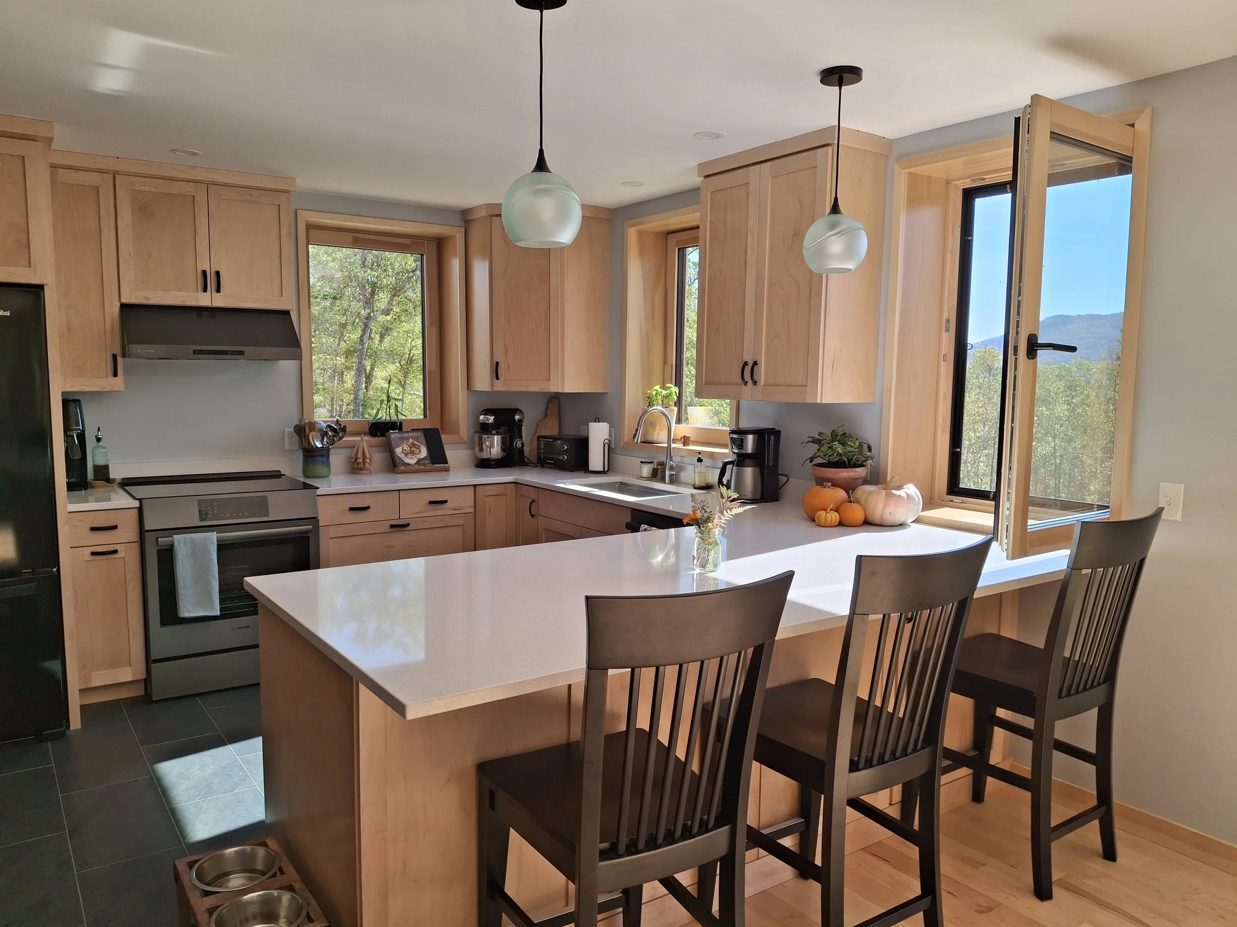 Perched atop a gorgeous New Hampshire hillside with epic views of Plymouth Mountain, “The Summit Home” stands as a testament to our commitment to high performance design and healthy living. A robust wall assembly—handcrafted timber frame elements, natural wood fiber insulation and locally milled cedar siding—-surrounds and protects a gorgeously refined interior space.