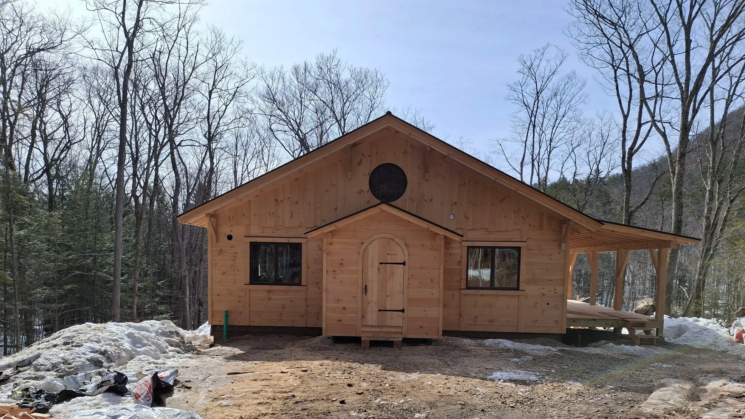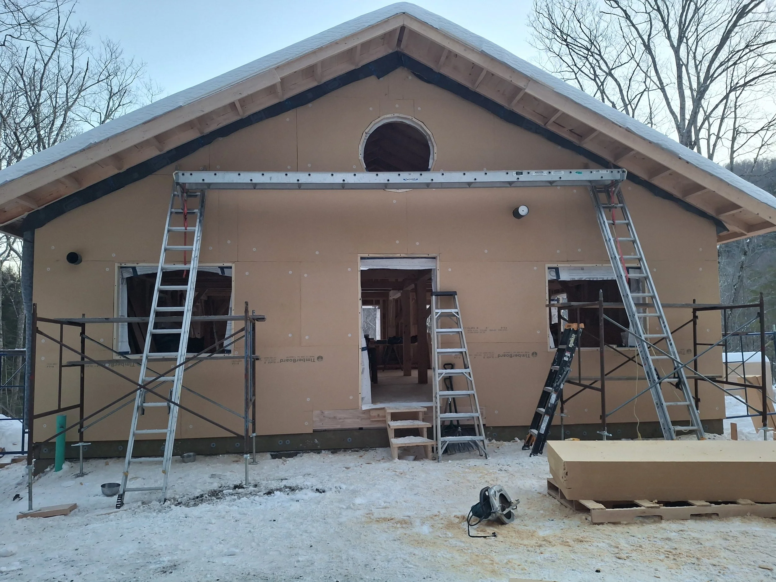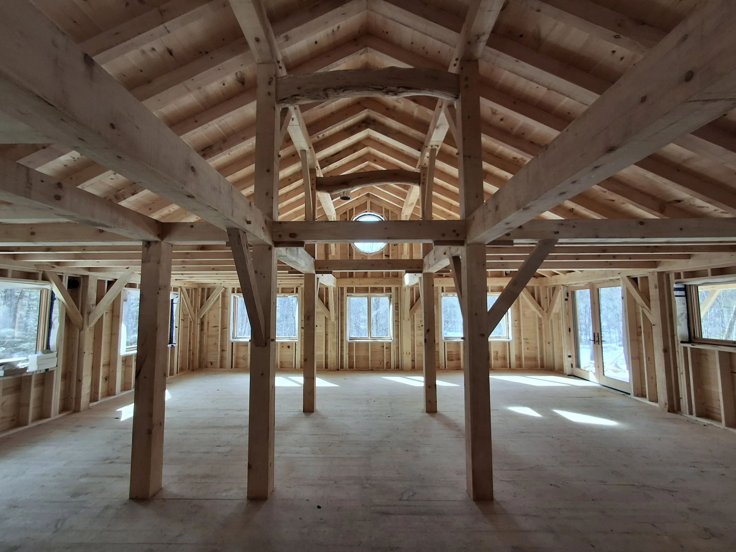 Our client sought a beautiful, locally milled timber frame for their project, opting for pine timbers and hard wood braces. Some of the timbers were harvested right on site. The final outcome is striking, toxin-free, durable frame that offers both structure and beauty.