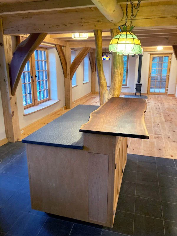 The Whitingham Project is full to the brim with hand-selected local timber and stone architectural elements. Whether it’s round forked white oak posts, locally quarried Ashfield granite schist countertops, or a flush, live edge slate hearth, each piece was carefully chosen to play its role.